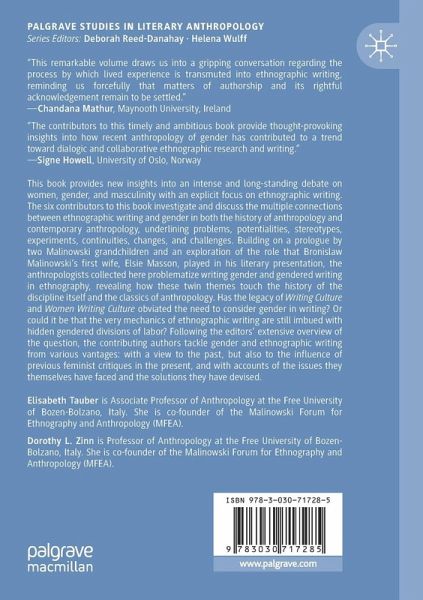 This book provides new insights into an intense and long-standing debate on women, gender, and masculinity with an explicit focus on ethnographic writing. The six contributors to this book investigate and discuss the multiple connections between ethnographic writing and gender in both the history of anthropology and contemporary anthropology, underlining problems, potentialities, stereotypes, experiments, continuities, changes, and challenges. Building on a prologue by two Malinowski grandchildren and an exploration of the role that Bronislaw Malinowski's first wife, Elsie Masson, played in his literary presentation, the anthropologists collected here problematize writing gender and gendered writing in ethnography, revealing how these twin themes touch the history of the discipline itself and the classics of anthropology. Has the legacy of Writing Culture and Women Writing Culture obviated the need to consider gender in writing? Or could it be thatthe very mechanics of ethnographic writing are still imbued with hidden gendered divisions of labor? Following the editors' extensive overview of the question, the contributing authors tackle gender and ethnographic writing from various vantages: with a view to the past, but also to the influence of previous feminist critiques in the present, and with accounts of the issues they themselves have faced and the solutions they have devised.
