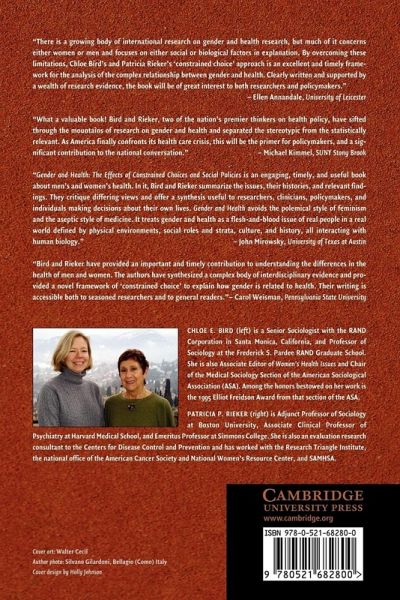 1. Gender differences in health: are they biological, social or both? 2. Gender and barriers to health: constrained choice in everyday decisions 3. National social policies and constrained choice 4. The impact of community on health 5. Priorities and expectations: men's and women's work, family life and health 6. Gender and individual health choices 7. Opportunities for change.