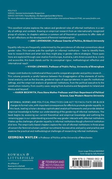 1. Analyzing Gender in Informal Institutions: An Introduction, Georgina Waylen / 2. What's in a Name? Mapping the Terrain of Informal Institutions and Gender Politics, Louise Chappell and Fiona Mackay / 3. Local Heroes and 'Cute Hoors': Informal Institutions, Male Over-Representation and Candidate Selection in the Republic of Ireland, Leah Culhane / 4. AExcavating Informal Institutional Enforcement Through 'Rapid' Ethnography: Lessons from the Australian Construction Industry, Louise Chappell and Natalie Galea / 5. Party Office, Male Homosocial Capital and Gendered Political Recruitment, Tánia Verge and Sílvia Claveria / 6. Disentangling Informality and Informal Rules: Explaining Gender Inequality in Chile's Executive Branch, Susan Franceschet / 7. Leveraging Informality, Rewriting Informal Rules: The Implementation of Gender Parity in Mexico, Jennifer M. Piscopo / 8. Negotiating Gender Equity in a Clientelist State: the Role of Informal Networks in Bangladesh, Sohela Nazneen / 9. An "Alternate" Story of Form