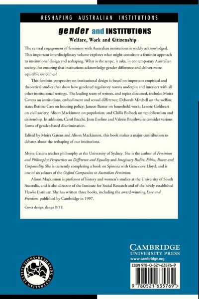 This important interdisciplinary volume explores what might constitute a feminist approach to institutional design and reshaping. What is the scope, it asks, in contemporary Australian society, for ensuring that institutions acknowledge gender difference and deliver more equitable outcomes? This feminist perspective on institutional design shows how gendered regulatory norms underpin and intersect with all other institutional settings. The leading team of writers includes Deborah Mitchell, Bettina Cass, Chilla Bulbeck, Carol Bacchi and Joan Eveline. Topics discussed include: institutions, embodiment and sexual difference; the welfare state; housing policy; household work; republicanism and citizenship; gender-based discrimination. This book makes a major contribution to debates about the reshaping of our institutions as we move towards the twenty-first century.