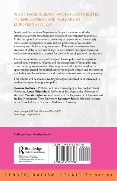 Gender and International Migration in Europe is a unique work which introduces a gender dimension into theories of contemporary migrations. As the European Union seeks to extend equal opportunities, increasingly restrictionist immigration policies and the persistence of racism, deny autonomy and choice to migrant women. This work demonstrates how processes of globalisation and change in state policies on employment and welfare have maintained a demand for diverse forms of gendered immigration.