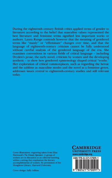 During the eighteenth century, British critics applied terms of gender to literature according to the belief that masculine values represented the best literature and feminine terms signified less important works or authors. Laura Runge contends however that the meaning of gendered terms like 'manly' or 'effeminate' changes over time, and that the language of eighteenth-century criticism cannot be fully understood without careful analysis of the gendered language of the era. She examines conventions in various fields of critical language - Dryden's prose, the early novel, criticism by women, and the developing aesthetic - to show how gendered epistemology shaped critical 'truths'. Her exploration of critical commonplaces, such as regarding the heroic and the sublime as masculine modes and the novel as a feminine genre, addresses issues central to eighteenth-century studies.
