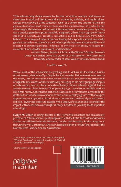 "This volume brings black women to the fore, as victims, martyrs, and heroes, as characters in works of literature and art, as agents, activists, and mythmakers. Gender and Lynching is a fine collection. Taken as a whole, this volume furthers the general literature on black women even beyond the important topic of lynching, while addressing both historical realities and fictionalizations in drama and prose. Lynching was a practice geared to capture the public imagination, the ultimate ugly performance designed to instruct, warn, sexualize, romanticize, and to discipline and frame future behavior. The essays in Evelyn Simien's anthology take a practice almost universally gendered as male - and therefore one in which gender has been almost invisible - and recasts it as primarily gendered. In doing so it invites us to creatively re-imagine the concepts of race, gender, punishment, and liberation." - Kristin Waters, Resident Scholar at the Women's Studies Research Center at Brandeis University, professor of Philosophy at Worcester State University, and co-editor of Black Women's Intellectual Traditions