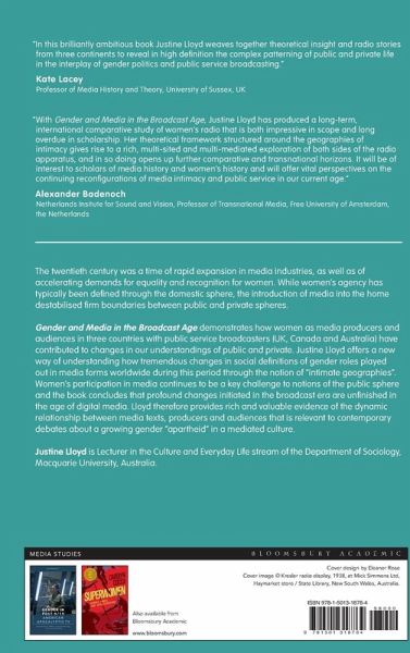 This book is open access and available on www.bloomsburycollections.com. It is funded by Knowledge Unlatched. The 20th century was a time of rapid expansion in media industries, as well as of accelerating demands for equality and recognition for women. While women's agency has typically been defined through the domestic sphere, the introduction of media into the home destabilised firm boundaries between public and private spheres. Gender and Media in the Broadcast Age demonstrates how women as media producers and audiences in three countries with public service broadcasters (UK, Canada and Australia) have contributed to changes in our understandings of public and private. Justine Lloyd offers a new way of understanding how tremendous changes in social definitions of gender roles played out in media forms worldwide during this period through the notion of 'intimate geographies'. Women's participation in media continues to be a key challenge to notions of the public sphere and the book concludes that profound changes initiated in the broadcast era are unfinished in the age of digital media. Lloyd therefore provides rich and valuable evidence of the dynamic relationship between media texts, producers and audiences that is relevant to contemporary debates about a growing gender 'apartheid' in a mediated culture.