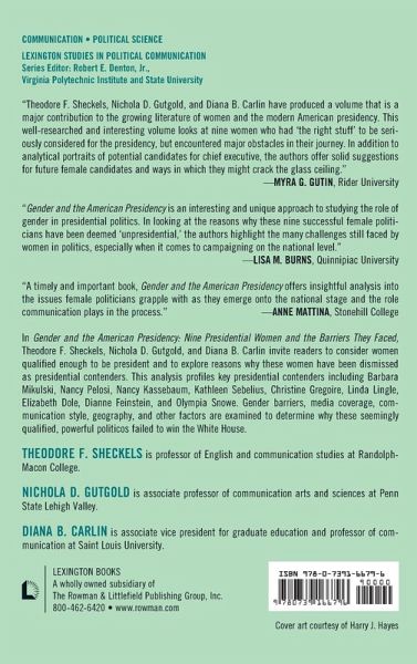 In Gender and the American Presidency: Nine Presidential Women and the Barriers They Faced, Theodore F. Sheckels, Nichola D. Gutgold, and Diana Bartelli Carlin invite the audience to consider women qualified enough to be president and explores reasons why they have been dismissed as presidential contenders. This analysis profiles key presidential contenders including Barbara Mikulski, Nancy Pelosi, Nancy Kassebaum, Kathleen Sebelius, Christine Gregoire, Linda Lingle, Elizabeth Dole, Dianne Feinstein, and Olympia Snowe. Gender barriers, media coverage, communication style, geography, and other factors are examined to determine why these seemingly qualified, powerful politicos failed to win the White House.