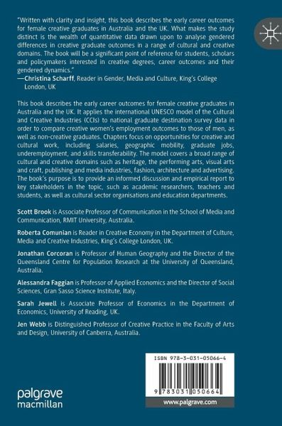 This book describes the early career outcomes for female creative graduates in Australia and the UK. It applies the international UNESCO model of the Cultural and Creative Industries (CCIs) to national graduate destination survey data in order to compare creative women's employment outcomes to those of men, as well as non-creative graduates. Chapters focus on opportunities for creative and cultural work, including salaries, geographic mobility, graduate jobs, underemployment, and skills transferability. The model covers a broad range of cultural and creative domains such as heritage, the performing arts, visual arts and craft, publishing and media industries, fashion, architecture and advertising. The book's purpose is to provide an informed discussion and empirical report to key stakeholders in the topic, such as academic researchers, teachers and students, as well as cultural sector organisations and education departments.