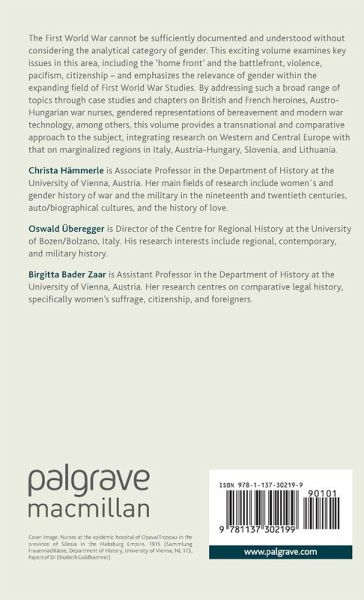 1. Introduction: Women's and Gender History of the First World War - Topics, Concepts, Perspectives; Christa Hämmerle, Oswald Überegger and Birgitta Bader Zaar 2. Women Behind the Lines: The Friuli Region as a Case Study of Total Mobilization, 1915-1917; Matteo Ermacora 3. Imagining and Communicating Violence: The Correspondence of a Berlin Family, 1914 to 1918; Dorothee Wierling 4. Love in the Trenches: German Soldiers' Conceptions of Sexual Deviance and Hegemonic Masculinity in the First World War; Jason Crouthamel 5. Visualizing 'War Hysterics': Strategies of Feminization and Re-Masculinization in Scientific Cinematography, 1916-1918; Julia Barbara Köhne 6. 'Mentally broken, physically a wreck ...': Violence in War Accounts of Nurses in Austro-Hungarian Service; Christa Hämmerle 7. Remembering French and British First World War Heroines; Alison S. Fell 8. The Baby in the Gas Mask: Motherhood, Wartime Technology, and the Gendered Division between the Fronts During and After the First World War; Susan R. Grayzel 9. The Female Mourner: Gender and the Moral Economy of Grief During the First World War; Claudia Siebrecht 10. French Boys and Girls in the Great War: Gender and the History of Children's Experiences 1914-1918; Manon Pignot 11. Towards a New Internationalism: Pacifist Journals Edited by Women, 1914-1919; Bruna Bianchi 12. 'A foolish dream of sisterhood': Anti-Pacifist Debates in the German Women's Movement, 1914-1919; Ingrid Sharp 13 . War Activities and Citizenship Rights in and outside the Occupied Zone: Lithuanian Women During the First World War; Virginija Jureniene 14. Love for the Nation in Times of War: Strategies and Discourses of the National and Political Mobilization of Slovene Women in Carinthia from 1917 to 1920; Tina Bahovec