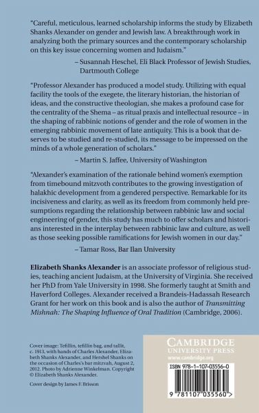 The rule that exempts women from rituals that need to be performed at specific times (so-called timebound, positive commandments) has served for centuries to stabilize Jewish gender. It has provided a rationale for women's centrality at home and their absence from the synagogue. Departing from dominant popular and scholarly views, Elizabeth Shanks Alexander argues that the rule was not conceived to structure women's religious lives, but rather became a tool for social engineering only after it underwent shifts in meaning during its transmission. Alexander narrates the rule's complicated history, establishing the purposes for which it was initially formulated and the shifts in interpretation that led to its being perceived as a key marker of Jewish gender. At the end of her study, Alexander points to women's exemption from particular rituals (Shema, tefillin and Torah study), which, she argues, are better places to look for insight into rabbinic gender.