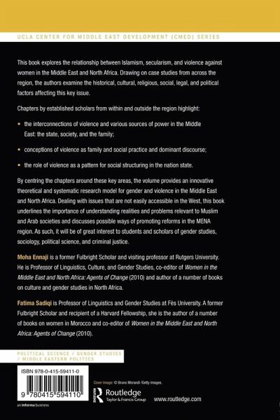 This book explores the relationship between Islamism, secularism and violence against women in the Middle East and North Africa. Drawing on case studies from across the region, the authors examine the historical, cultural, religious, social, legal and political factors affecting this key issue. Chapters by established scholars from within and outside the region highlight: the interconnections of violence and various sources of power in the Middle East: the state, society, and the family conceptions of violence as family and social practice and dominant discourse the role of violence as pattern for social structuring in the nation state. By centring the chapters around these key areas, the volume provides an innovative theoretical and systematic research model for gender and violence in the Middle East and North Africa. Dealing with issues that are not easily accessible in the West, this book underlines the importance of understanding realities and problems relevant to Muslim and Arab societies and discusses possible ways of promoting reforms in the MENA region. As such it will be of great interest to students and scholars of gender studies, sociology, political science and criminal justice.