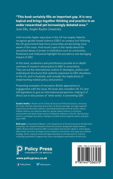 Dr Sundari Anitha is Reader at the School of Social and Political Sciences, University of Lincoln. She has researched and written on forced marriage, marriage migrants' experiences of domestic violence, transnational abandonment of women, dowry-related violence, sex selective abortion, gender-based violence in university communities and South Asian women's industrial militancy in the UK. She previously managed a Women's Aid refuge and worked for Asha Projects, a specialist refuge for South Asian survivors of domestic violence and has been active in campaigns and policy-making to combat violence against women and girls since 1999. Dr Ruth Lewis is Associate Professor in the Department of Social Sciences at Northumbria University. Her research focuses on feminist activism and gender-based violence (GBV). Recent work examines GBV in universities and activism about it, online abuse of feminists, feminism amongst women students, and women-only space as a political strategy. Earlier research examined legal responses to intimate partner violence, including perpetrators programmes, and a sociological examination of homicide. She has been involved in feminist activism and networks of various kinds, in academic and other communities.