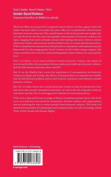 This book offers new perspectives on gender-based violence in three regions where the subject has been taboo in everyday discourse often due to patriarchal cultural norms that limit women's autonomy. The contributions to this book provide rare insight into not only the levels and the socio-demographic determinants of domestic violence, but topics ranging from men's attitudes toward wife beating; domestic violence-related adolescent deaths, and women's health problems due to sexual and physical abuse. With a comprehensive introduction that provides a comparative international research framework for discussing gender-based violence in these three unique regions, this volume provides a key basis for understanding gender-based violence on a more global level.