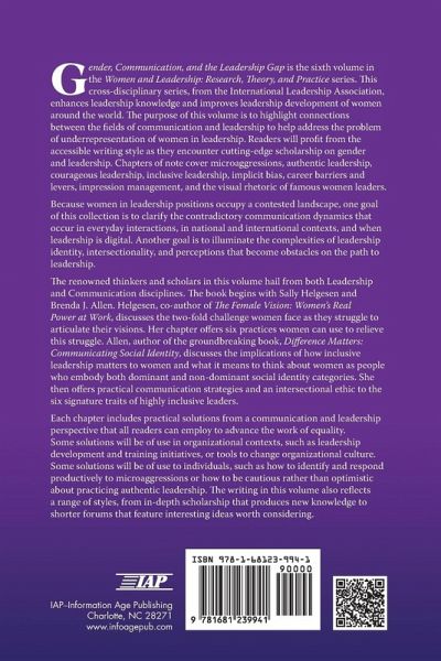 Gender, Communication, and the Leadership Gap is the sixth volume in the Women and Leadership: Research, Theory, and Practice series. This cross-disciplinary series, from the International Leadership Association, enhances leadership knowledge and improves leadership development of women around the world. The purpose of this volume is to highlight connections between the fields of communication and leadership to help address the problem of underrepresentation of women in leadership. Readers will profit from the accessible writing style as they encounter cutting-edge scholarship on gender and leadership. Chapters of note cover microaggressions, authentic leadership, courageous leadership, inclusive leadership, implicit bias, career barriers and levers, impression management, and the visual rhetoric of famous women leaders. Because women in leadership positions occupy a contested landscape, one goal of this collection is to clarify the contradictory communication dynamics that occur in everyday interactions, in national and international contexts, and when leadership is digital. Another goal is to illuminate the complexities of leadership identity, intersectionality, and perceptions that become obstacles on the path to leadership. The renowned thinkers and scholars in this volume hail from both Leadership and Communication disciplines. The book begins with Sally Helgesen and Brenda J. Allen. Helgesen, co-author of The Female Vision: Women's Real Power at Work, discusses the two-fold challenge women face as they struggle to articulate their visions. Her chapter offers six practices women can use to relieve this struggle. Allen, author of the groundbreaking book, Difference Matters: Communicating Social Identity, discusses the implications of how inclusive leadership matters to women and what it means to think about women as people who embody both dominant and non-dominant social identity categories. She then offers practical communication strategies and an intersectional ethic to the six signature traits of highly inclusive leaders. Each chapter includes practical solutions from a communication and leadership perspective that all readers can employ to advance the work of equality. Some solutions will be of use in organizational contexts, such as leadership development and training initiatives, or tools to change organizational culture. Some solutions will be of use to individuals, such as how to identify and respond productively to micro-aggressions or how to be cautious rather than optimistic about practicing authentic leadership. The writing in this volume also reflects a range of styles, from in-depth scholarship that produces new knowledge to shorter forums that feature interesting ideas worth considering.