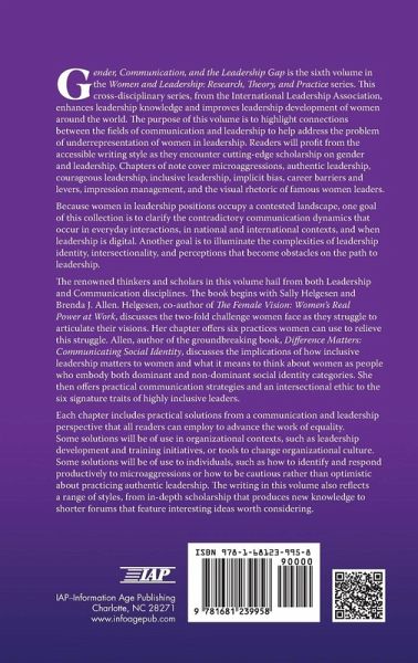 Gender, Communication, and the Leadership Gap is the sixth volume in the Women and Leadership: Research, Theory, and Practice series. This cross-disciplinary series, from the International Leadership Association, enhances leadership knowledge and improves leadership development of women around the world. The purpose of this volume is to highlight connections between the fields of communication and leadership to help address the problem of underrepresentation of women in leadership. Readers will profit from the accessible writing style as they encounter cutting-edge scholarship on gender and leadership. Chapters of note cover microaggressions, authentic leadership, courageous leadership, inclusive leadership, implicit bias, career barriers and levers, impression management, and the visual rhetoric of famous women leaders. Because women in leadership positions occupy a contested landscape, one goal of this collection is to clarify the contradictory communication dynamics that occur in everyday interactions, in national and international contexts, and when leadership is digital. Another goal is to illuminate the complexities of leadership identity, intersectionality, and perceptions that become obstacles on the path to leadership. The renowned thinkers and scholars in this volume hail from both Leadership and Communication disciplines. The book begins with Sally Helgesen and Brenda J. Allen. Helgesen, co-author of The Female Vision: Women's Real Power at Work, discusses the two-fold challenge women face as they struggle to articulate their visions. Her chapter offers six practices women can use to relieve this struggle. Allen, author of the groundbreaking book, Difference Matters: Communicating Social Identity, discusses the implications of how inclusive leadership matters to women and what it means to think about women as people who embody both dominant and non-dominant social identity categories. She then offers practical communication strategies and an intersectional ethic to the six signature traits of highly inclusive leaders. Each chapter includes practical solutions from a communication and leadership perspective that all readers can employ to advance the work of equality. Some solutions will be of use in organizational contexts, such as leadership development and training initiatives, or tools to change organizational culture. Some solutions will be of use to individuals, such as how to identify and respond productively to micro-aggressions or how to be cautious rather than optimistic about practicing authentic leadership. The writing in this volume also reflects a range of styles, from in-depth scholarship that produces new knowledge to shorter forums that feature interesting ideas worth considering.