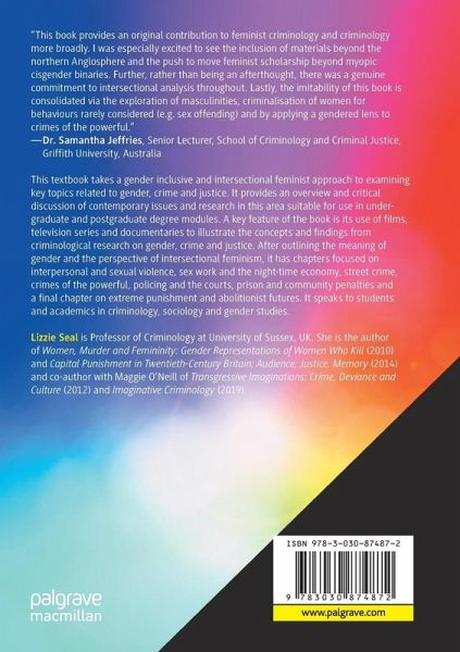 This textbook takes a gender inclusive and intersectional feminist approach to examining key topics related to gender, crime and justice. It provides an overview and critical discussion of contemporary issues and research in this area suitable for use in undergraduate and postgraduate degree modules. A key feature of the book is its use of films, television series and documentaries to illustrate the concepts and findings from criminological research on gender, crime and justice. After outlining the meaning of gender and the perspective of intersectional feminism, it has chapters focused on interpersonal and sexual violence, sex work and the night-time economy, street crime, crimes of the powerful, policing and the courts, prison and community penalties and a final chapter on extreme punishment and abolitionist futures. It speaks to students and academics in criminology, sociology and gender studies.