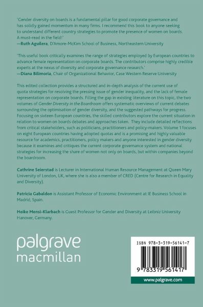 1. Setting the Scene: Women on Boards in Countries with Quota Regulations; Heike Mensi-Klarbach, Cathrine Seierstad and Patricia Gabaldon.- 2. Gender Quotas on Corporate Boards in Norway: 10 Years Later and Lessons Learned; Cathrine Seierstad and Morten Huse.- 3. Spain - Gender Diversity on Boards in Spain: A Non-Mandatory Quota; Patricia Gabaldon and Daniela Gimenez.- 4. Gender Diversity on Boards in Iceland: Pathway to Gender Quota Law Following a Financial Crisis; Audur Arna Arnadottir and Throstur Olaf Sigurjonsson.- 5. France - Gender Diversity on French Boards: Examples of Success from a Hard Law; Emmanuel Zenou, Isabelle Allemand and Bénédicte Brullebaut.- 6. Women on Boards in Italy: The Pressure of Public Policies; Alessandra Rigolini and Morten Huse.- 7. Belgium - Male/Female United in the Board Room; Abigail Levrau.- 8. The Netherlands - Gender Diversity on Corporate Boards in the Netherlands: Waiting on the World to Change; Sonja Kruisinga and Linda Senden.- 9. Germany - Women's Access to Boards in Germany: Regulation and Symbolic Change; Anja Kirsch.- 10. Gender Diversity in the Boardroom: The Multiple Versions of Quota Laws in Europe; Patricia Gabaldon, Heike Mensi-Klarbach and Cathrine Seierstad.