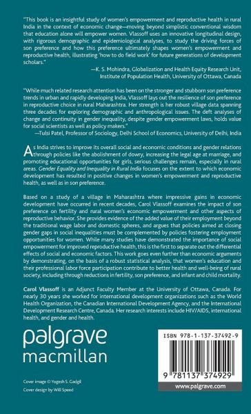 As India strives to improve overall social and economic conditions and gender relations through policies such as the abolishment of dowry, increasing the legal age at marriage, and promoting educational opportunities for girls, serious challenges remain, especially in rural areas. Gender Equality and Inequality in Rural India focuses on the extent to which economic development has resulted in positive changes in women's empowerment and reproductive health, as well as in sex preference. Based on a study from a village in Maharashtra where impressive gains in economic development have occurred in recent decades, Carol Vlassoff examines the impact of son preference on fertility and rural women's economic empowerment and other aspects of reproductive behavior. She provides evidence of the added value of their employment beyond the traditional wage labor and domestic spheres, and argues that policies aimed at closing gender gaps in social inequalities must be complemented by policies fostering employment opportunities for women. While many studies have demonstrated the importance of social empowerment for improved reproductive health, this is the first to separate out the differential effects of social and economic factors. This work goes even further than economic arguments by demonstrating, on the basis of a robust statistical analysis, that women's education and their professional labor force participation contribute to better health and wellbeing of rural society, including through reductions in fertility, son preference, and infant and child mortality.