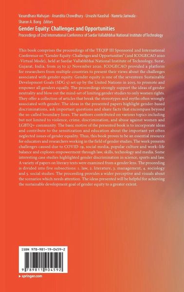 This book comprises the proceedings of the TEQIP III Sponsored 2nd International Conference on "Gender Equity: Challenges and Opportunities" (2nd ICOGECAO 2020 -Virtual Mode), held at Sardar Vallabhbhai National Institute of Technology, Surat, Gujarat, India, from 25 to 27 November 2020. ICOGECAO provided a platform for researchers from multiple countries to present their views about the challenges associated with gender equity. Gender equity is one of the seventeen Sustainable Development Goals (SDG 5) set up by the United Nations in 2015, to promote and empower all genders equally. The proceedings strongly support the ideas of gender neutrality and blow out the mind-set of limiting gender studies to only women rights. They offer a collection of articles that break the stereotypes and myths often wrongly associated with gender. The ideas in the presented papers highlight gender-based discriminations, ask important questions and share facts that encompass beyond the so-calledboundary lines. The authors contributed on various topics including but not limited to violence, crime, discrimination, and abuse against women and LGBTQ+ community. The basic motive of the presented book is to incorporate ideas and contribute to the sensitization and education about the important yet often neglected issues of gender equality. Thus, this book proves to be an essential resource for educators and researchers working in the field of gender studies. The work presents challenges caused due to COVID-19, social media, popular culture and work-life balance and explores empowerment through law, skills, technology and media. Some interesting case studies highlighted gender discrimination in science, sports and law. A variety of papers on literary texts were examined from a gender lens. The proceeding is divided into five subsections: 1. law, 2. literature, 3. management, 4. sociology and 5. social studies. The proceeding provides a wider perceptive and visuals about the scenarios which needs attention. The ideas presented will be helpful for achieving the sustainable development goal of gender equity to a greater extent.