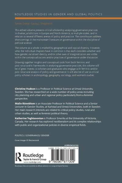 This edited volume presents critical scholarship analysing governance practices in diverse jurisdictions in Europe and North America, at multiple scales, and in relation to several different arenas of policy and practice. The contributors address shortcomings in the mainstream literature on governance within the discipline of political science. The volume as a whole is marked by geographical and topical diversity. However, what the individual chapters have in common is that each considers whether and how gender, racialized identity, and/or other axes of marginalization are visible within the conceptualizations and/or practices of governance under discussion. Drawing together insights and conceptual tools from both feminist and post-structuralist frameworks in analysing governance practices, this volume will be of great interest to scholars and graduates who engage with feminist and/or post-structural analysis of policy and governance. It will also be of use to critical policy scholars in anthropology, geography, sociology, and women's studies.