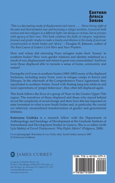 How and where did returning Nuer refugees make their 'homes' in southern Sudan? How were gender relations and identity redefined as a result of war, displacement and return to post-war communities? And how were those displaced able to recreate a sense of home, community and nation? During the civil wars in southern Sudan (1983-2005) many of the displaced Sudanese, including many Nuer, were in refugee camps in Kenya and Ethiopia. In the aftermath of the Comprehensive Peace Agreement, they repatriated to southern Sudan. Faced with finding long-lost relatives and local expectations of 'proper behaviour', they often felt displaced again. This book follows the lives of a group of Nuer in the Greater Upper Nile region. The narratives of those displaced and those who stayed behind reveal the complexity of social change, in particular, the crucial yet relatively unconsidered transformation of gender and generational relations, and how this has impacted on state formation in what is now South Sudan.