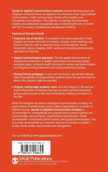 Gender in Applied Communication Contexts explores the intersection and integration of feminist theory as applied to four important areas: organizational communication, health communication, family communication, and instructional communication. This collection of readings links theoretical insights and contributions to pragmatic ways of improving the lives of women and men in a variety of professional and personal situations. Gender in Applied Communication Contexts is recommended for upper-division and graduate-level courses in gender and communication, feminist theory, organizational communication, health communication, instructional communication, and applied communication. This anthology is also recommended as a research resource for scholars in Women's Studies, Family Studies, and Business and Management.