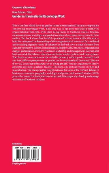 This is he first edited book on gender issues in transnational business cooperation concerning knowledge work. This area has so far been researched mainly by organizational theorists, with their background in business studies, finance, communication or sociology, and gender has seldom been taken into account in these studies. This book shows how fruitful a gendered take on issues within this area is, both for a deepened understanding of these organizational issues and for a widened understanding of gender issues. The chapters in the book cover a range of themes from a gender perspective; culture, communication, identity work, structures, organizational change, globalization, mobility, resistance, leadership and management, international business, work life balance, education and labour market, policies and value systems. The chapters also demonstrate the multidisciplinarity within gender research itself and how different perspectives on gender can be combined and developed. They onthe social constructionist approach of "doing gender", feminist organization theory, gendered discourse analysis, techno-feminism, and critical studies on men and masculinities. The book provides insights relevant for some of the relevant debates in business, economics, geography, sociology, and gender and women's studies. While primarily a research volume, the book is also useful for people who develop and manage transnational business relations.