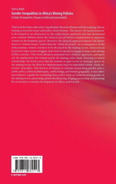This book develops a discursive 'equalitarian' theoretical framework for studying African mining ecosystem issues and policy interventions. The theory of 'equalitarianism' is developed as an alternative to the reductionist approach that has dominated post-colonial debates about the classical jus ad bellum requirements to empower women in development spaces. However, the classical approach narrows the debate down to "women issues," rather than the 'whole-of-society.' As a consequence of this reductionism, women continue to be devalued in the mining sector, characterized by poverty traps, power struggles, and a lack of capacity to engage in large-scale mining (LSM) activities. This book advances principles for a holistic approach, and spells out the implications for women across the mining value chain. Drawing on moral scholarship, the book poses that for women to gain access to strategic spaces in the mining sector, the drive for empowerment must be embedded within 'whole-of-society' principles. This book is of interest to scholars researching gender policy, public policy, political philosophy, conflictology, and human geography. It also offers practitioners a guide for evaluating their policy work on mainstreaming gender in the mining sector, presenting options for financing, forging partnership and planning for an inclusive economic development in Africa, and beyond.