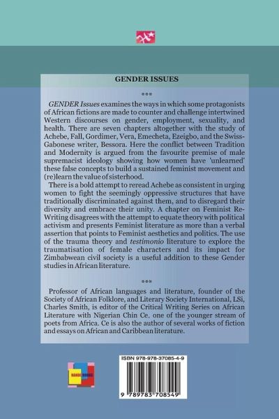 Gender Issues in African Literature examines the ways in which some protagonists of African fictions are made to counter and challenge intertwined Western discourses on gender, employment, sexuality, and health. Here the conflict between Tradition and Modernity is argues from the favourite premise of male supremacist ideology showing how women have ëunlearnedí these false concepts to build a sustained feminist movement and (re)learn the value of sisterhood. There is a bold attempt to reread Achebe as a consistent in urging women to fight the seemingly oppressive structures that have traditionally discriminated against them, and to disregard their diversity and embrace their unity. A chapter of Feminist Re-writing disagrees with the attempt to equate theory with political activism and presents Feminist literature as more than a verbal assertion that points to Feminist aesthetics and politics. The use of the trauma theory and testimony literature to explore traumatisation of female characters and its impact for Zimbabwean civil society is a useful addition to these gender studies in African literature.