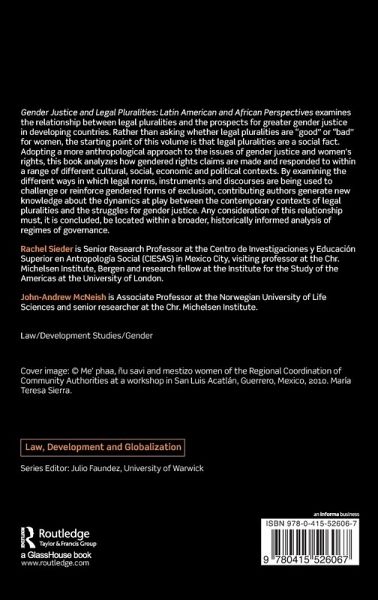 Gender Justice and Legal Pluralities: Latin American and African Perspectives examines the relationship between legal pluralities and the prospects for greater gender justice in developing countries. Rather than asking whether legal pluralities are 'good' or 'bad' for women, the starting point of this volume is that legal pluralities are a social fact. Adopting a more anthropological approach to the issues of gender justice and women's rights, it analyzes how gendered rights claims are made and responded to within a range of different cultural, social, economic and political contexts. By examining the different ways in which legal norms, instruments and discourses are being used to challenge or reinforce gendered forms of exclusion, contributing authors generate new knowledge about the dynamics at play between the contemporary contexts of legal pluralities and the struggles for gender justice. Any consideration of this relationship must, it is concluded, be located within a broader, historically informed analysis of regimes of governance.