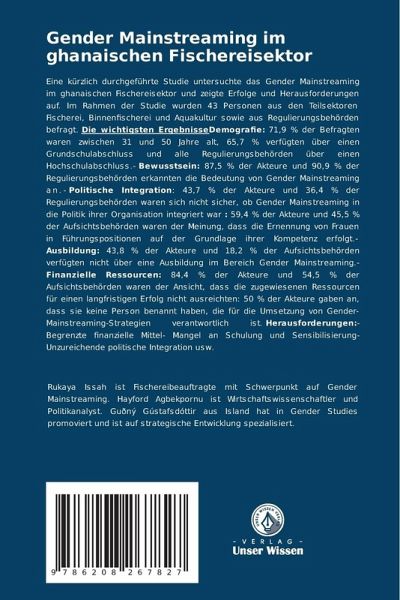 Eine kürzlich durchgeführte Studie untersuchte das Gender Mainstreaming im ghanaischen Fischereisektor und zeigte Erfolge und Herausforderungen auf. Im Rahmen der Studie wurden 43 Personen aus den Teilsektoren Fischerei, Binnenfischerei und Aquakultur sowie aus Regulierungsbehörden befragt. Die wichtigsten ErgebnisseDemografie: 71,9 % der Befragten waren zwischen 31 und 50 Jahre alt, 65,7 % verfügten über einen Grundschulabschluss und alle Regulierungsbehörden über einen Hochschulabschluss.- Bewusstsein: 87,5 % der Akteure und 90,9 % der Regulierungsbehörden erkannten die Bedeutung von Gender Mainstreaming an.- Politische Integration: 43,7 % der Akteure und 36,4 % der Regulierungsbehörden waren sich nicht sicher, ob Gender Mainstreaming in die Politik ihrer Organisation integriert war : 59,4 % der Akteure und 45,5 % der Aufsichtsbehörden waren der Meinung, dass die Ernennung von Frauen in Führungspositionen auf der Grundlage ihrer Kompetenz erfolgt.- Ausbildung: 43,8 % der Akteure und 18,2 % der Aufsichtsbehörden verfügten nicht über eine Ausbildung im Bereich Gender Mainstreaming.- Finanzielle Ressourcen: 84,4 % der Akteure und 54,5 % der Aufsichtsbehörden waren der Ansicht, dass die zugewiesenen Ressourcen für einen langfristigen Erfolg nicht ausreichten: 50 % der Akteure gaben an, dass sie keine Person benannt haben, die für die Umsetzung von Gender-Mainstreaming-Strategien verantwortlich ist. Herausforderungen:- Begrenzte finanzielle Mittel- Mangel an Schulung und Sensibilisierung- Unzureichende politische Integration usw.