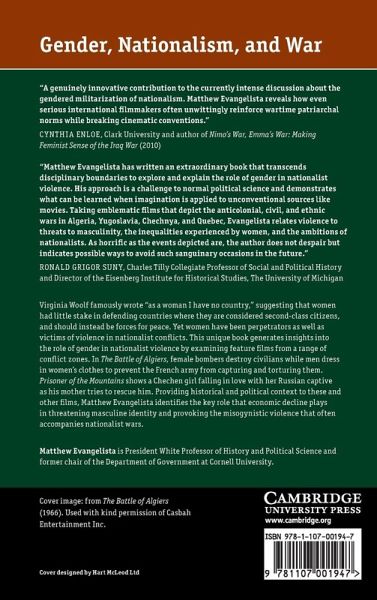Virginia Woolf famously wrote 'as a woman I have no country', suggesting that women had little stake in defending countries where they are considered second-class citizens, and should instead be forces for peace. Yet women have been perpetrators as well as victims of violence in nationalist conflicts. This unique book generates insights into the role of gender in nationalist violence by examining feature films from a range of conflict zones. In The Battle of Algiers, female bombers destroy civilians while men dress in women's clothes to prevent the French army from capturing and torturing them. Prisoner of the Mountains shows a Chechen girl falling in love with her Russian captive as his mother tries to rescue him. Providing historical and political context to these and other films, Matthew Evangelista identifies the key role that economic decline plays in threatening masculine identity and provoking the misogynistic violence that often accompanies nationalist wars.