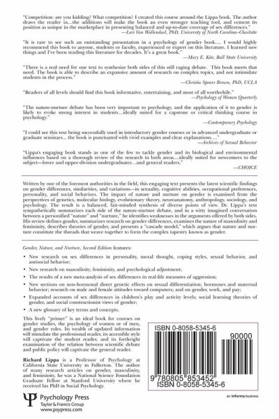 This engaging text presents the latest scientific findings on gender differences, similarities, and variations--in sexuality, cognitive abilities, occupational preferences, personality, and social behaviors. The impact of nature and nurture on gender is examined from the perspectives of genetics, molecular biology, evolutionary theory, neuroanatomy, sociology, and psychology. The result is a balanced, fair-minded synthesis of diverse points of view. Dr. Lippa's text sympathetically summarizes each side of the nature-nurture debate, and in a witty imagined conversation between a personified "nature" and "nurture," he identifies weaknesses in the arguments offered by both sides. His review defines gender, summarizes research on gender differences, examines the nature of masculinity and femininity, describes theories of gender, and presents a "cascade model," which argues that nature and nurture weave together to form the complex tapestry known as gender. Gender, Nature, and Nurture, Second Edition features: *new research on sex differences in personality, moral thought, coping styles, sexual and antisocial behavior, and psychological adjustment; *the results of a new meta-analysis of sex differences in real-life measures of aggression; *new sections on non-hormonal direct genetic effects on sexual differentiation; hormones and maternal behavior; and on gender, work, and pay; and *expanded accounts of sex differences in children's play and activity levels; social learning theories of gender, and social constructionist views of gender. This lively "primer" is an ideal book for courses on gender studies, the psychology of women, or of men, and gender roles. Its wealth of updated information will stimulate the professional reader, and its accessible style will captivate the student and general reader.