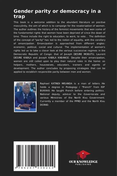 This book is a welcome addition to the abundant literature on positive masculinity, the aim of which is to campaign for the revalorization of women. The author outlines the history of the feminist movements that won some of the fundamental rights that women have been deprived of since the dawn of time. These include the right to education, to work, to vote... The definition of the concept of "parity" has led to the notion of equality, with the corollary of emancipation. Emancipation is approached from different angles: economic, political, social and cultural. The implementation of women's rights led us to take a closer look at the various successive regimes in the Democratic Republic of Congo: that of Joseph DESIRE MOBUTU, Laurent DESIRE KABILA and Joseph KABILA KABANGE. Despite their emancipation, women are still called upon to play their natural roles in the home: as helpers, mothers, housewives, educators, trainers and agents of development. The author concludes by proposing strategies that can be applied to establish responsible parity between men and women.