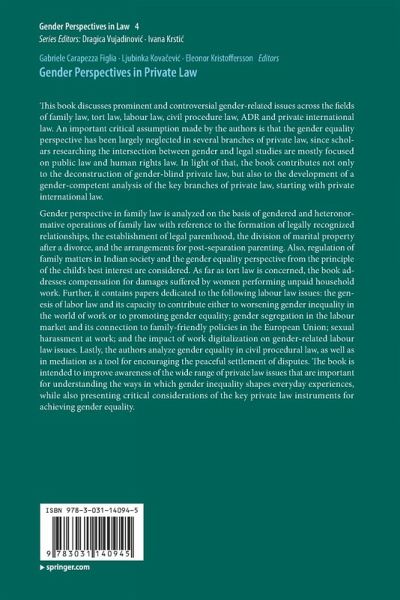 Gender perspective in family law is analyzed on the basis of gendered and heteronormative operations of family law with reference to the formation of legally recognized relationships, the establishment of legal parenthood, the division of marital property after a divorce, and the arrangements for post-separation parenting. Also, regulation of family matters in Indian society and the gender equality perspective from the principle of the child's best interest are considered. As far as tort law is concerned, the book addresses compensation for damages suffered by women performing unpaid household work. Further, it contains papers dedicated to the following labour law issues: the genesis of labor law and its capacity to contribute either to worsening gender inequality in the world of work or to promoting gender equality; gender segregation in the labour market and its connection to family-friendly policies in the European Union; sexual harassment at work; and the impact of work digitalization on gender-related labour law issues. Lastly, the authors analyze gender equality in civil procedural law, as well as in mediation as a tool for encouraging the peaceful settlement of disputes. The book is intended to improve awareness of the wide range of private law issues that are important for understanding the ways in which gender inequality shapes everyday experiences, while also presenting critical considerations of the key private law instruments for achieving gender equality.