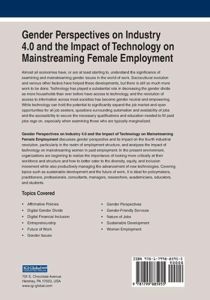 Almost all economies have, or are at least starting to, understand the significance of examining and mainstreaming gender issues in the world of work. Sociocultural evolution and various other factors have helped these developments, but there is still so much more work to be done. Technology has played a substantial role in decreasing the gender divide as more households than ever before have access to technology, and the revolution of access to information across most societies has become gender neutral and empowering. While technology can hold the potential to significantly expand the job market and open opportunities for all job seekers, questions surrounding automation and availability of jobs and the accessibility to secure the necessary qualifications and education needed to fill paid jobs rage on, especially when examining those who are typically marginalized. Gender Perspectives on Industry 4.0 and the Impact of Technology on Mainstreaming Female Employment discusses gender perspective and its impact on the fourth industrial revolution, particularly in the realm of employment structure, and analyzes the impact of technology on mainstreaming women in paid employment. In the present environment, organizations are beginning to realize the importance of looking more critically at their workforce and structure and how to better cater to the diversity, equity, and inclusion movement while also productively managing the advancement of new technologies. Covering topics such as sustainable development and the future of work, it is ideal for policymakers, practitioners, professionals, consultants, managers, researchers, academicians, educators, and students.