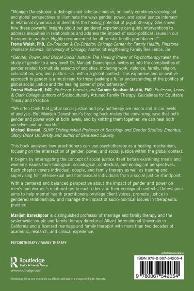 "Gender, Power, and Global Social Justice: The Healing Power of Psychotherapy takes the study of gender to a new level! Dr. Manijeh Daneshpour invites us into the complexities of gender related to multiple aspects of societies, including work, violence, family, religion, colonization, war, and politics - all within a global context. This expansive and innovative approach to gender is a must read for those seeking a fuller understanding of the politics of global social justice and the healing power of psychotherapy."