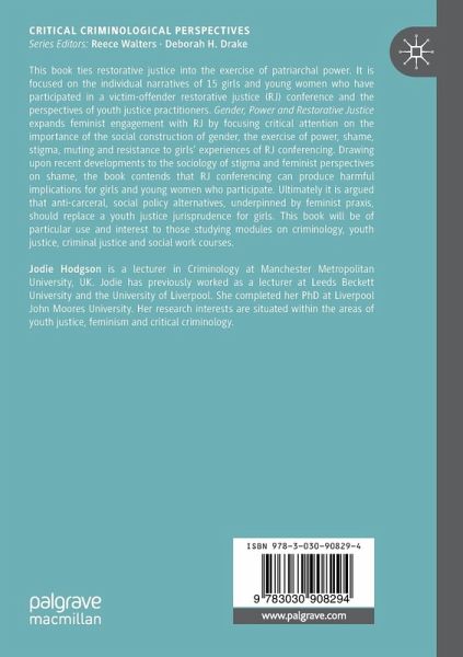 This book ties restorative justice into the exercise of patriarchal power. It is focused on the individual narratives of 15 girls and young women who have participated in a victim-offender restorative justice (RJ) conference and the perspectives of youth justice practitioners. Gender, Power and Restorative Justice expands feminist engagement with RJ by focusing critical attention on the importance of the social construction of gender, the exercise of power, shame, stigma, muting and resistance to girls' experiences of RJ conferencing. Drawing upon recent developments to the sociology of stigma and feminist perspectives on shame, the book contends that RJ conferencing can produce harmful implications for girls and young women who participate. Ultimately it is argued that anti-carceral, social policy alternatives, underpinned by feminist praxis, should replace a youth justice jurisprudence for girls. This book will be of particular use and interest to those studying modules on criminology, youth justice, criminal justice and social work courses.