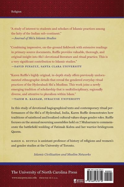 In this study of devotional hagiographical texts and contemporary ritual performances of the Shi'a of Hyderabad, India, Karen Ruffle demonstrates how traditions of sainthood and localized cultural values shape gender roles. Ruffle focuses on the annual mourning assemblies held on 7 Muharram to commemorate the battlefield wedding of Fatimah Kubra and her warrior-bridegroom Qasem, who was martyred in 680 C.E. at the battle of Karbala, Iraq, before their marriage was consummated. Ruffle argues that hagiography, an important textual tradition in Islam, plays a dynamic role in constructing the memory, piety, and social sensibilities of a Shi'i community. Through the Hyderabadi rituals that idealize and venerate Qasem, Fatimah Kubra, and the other heroes of Karbala, a distinct form of sainthood is produced. These saints, Ruffle explains, serve as socioethical role models and religious paragons whom Shi'i Muslims aim to imitate in their everyday lives, improving their personal religious practice and social selves. On a broader community level, Ruffle observes, such practices help generate and reinforce group identity, shared ethics, and gendered sensibilities. By putting gender and everyday practice at the center of her study, Ruffle challenges Shi'i patriarchal narratives that present only men as saints and brings to light typically overlooked women’s religious practices.