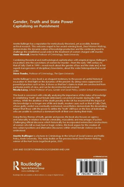 This book is concerned with critically analysing the importance of the status of knowledge in establishing 'truth' about female defendants convicted of murder during the 20th Century. While the abolition of the death penalty in the UK has insured that the impact of this knowledge is no longer one of life and death, modern cases such as that of Sally Clark, whose guilty verdict was eventually overturned, nevertheless demonstrate the devastating impact that those with the power to define the 'truth' still have on the lives of individuals who are unable to construct a dominant truth of their own during their trials. Using the key themes of truth, gender and power, the book also focuses on agency and rationality in relation to female criminality, masculinity and miscarriages of justice. Challenging official discourse which historically has incorporated entrenched constructions of women who kill as mad, bad or tragic victims, this book argues for the creation of new subject positions and alternative discourses within which female violence can be understood.