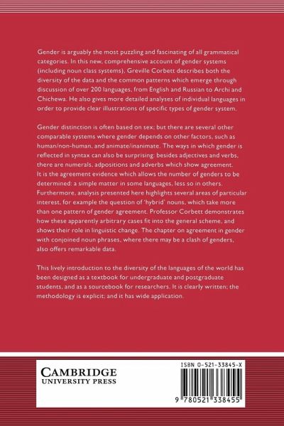 Gender is arguably the most puzzling and fascinating of all grammatical categories. In this new, comprehensive account of gender systems (including noun class systems), Greville Corbett describes both the diversity of the data and the common patterns which emerge through discussion of over 200 languages, from English and Russian to Archi and Chichewa. He also gives more detailed analyses of individual languages in order to provide clear illustrations of specific types of gender system.