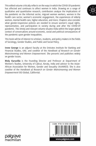 1: Gender dimensions of COVID 19: An overview.- 2: Pandemic crisis and economic engagement of women: A historical enquiry on implications of catastrophes on female economic participation.- 3: Economic challenges for women in post COVID India.- 4: Stay home, stay unproductive: Self -employed and home-based women entrepreneurs during COVID 19.- 5: The plight of migrant women workers: Looking at 'ghar wapsi' through a gender lens.- 6: COVID-19 and the challenges of Anganwadi and ASHA workers with special reference to Maharashtra.- 7: COVID-19- Gendered experiences of frontline health workers in Kerala.- 8: Existing reproductive rights and health framework for Indian women: Prevalent disharmony due to perinatal depression and its exacerbation due to Covid-19.- 9: Gender dimensions of mental health during COVID-19 in Assam.- 10: Quality of life of elderly women during the pandemic-COVID-19.- 11: Gender, the pandemic and education policies: Higher education at the cross roads.- 12: Challenges during and due to COVID-19 pandemic in the lives of transgender persons in Kerala.- 13: Undesirable citizens: Stigma and struggles of sex workers during the COVID-19 pandemic.- 14: Cyber crimes against Indian women: Before and during Covid-19.- 15: Gender equality in the criminal justice system of India: the state of Kerala during Covid-19.- 16: Conclusion.