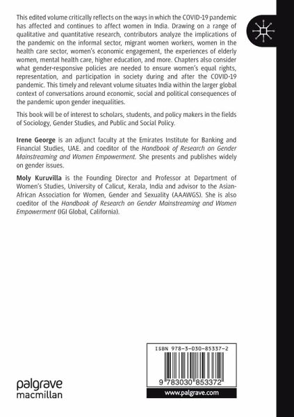 1: Gender dimensions of COVID 19: An overview.- 2: Pandemic crisis and economic engagement of women: A historical enquiry on implications of catastrophes on female economic participation.- 3: Economic challenges for women in post COVID India.- 4: Stay home, stay unproductive: Self -employed and home-based women entrepreneurs during COVID 19.- 5: The plight of migrant women workers: Looking at 'ghar wapsi' through a gender lens.- 6: COVID-19 and the challenges of Anganwadi and ASHA workers with special reference to Maharashtra.- 7: COVID-19- Gendered experiences of frontline health workers in Kerala.- 8: Existing reproductive rights and health framework for Indian women: Prevalent disharmony due to perinatal depression and its exacerbation due to Covid-19.- 9: Gender dimensions of mental health during COVID-19 in Assam.- 10: Quality of life of elderly women during the pandemic-COVID-19.- 11: Gender, the pandemic and education policies: Higher education at the cross roads.- 12: Challenges during and due to COVID-19 pandemic in the lives of transgender persons in Kerala.- 13: Undesirable citizens: Stigma and struggles of sex workers during the COVID-19 pandemic.- 14: Cyber crimes against Indian women: Before and during Covid-19.- 15: Gender equality in the criminal justice system of India: the state of Kerala during Covid-19.- 16: Conclusion.