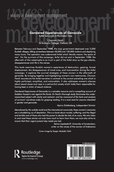 Between February and September 1988, the Iraqi government destroyed over 2000 Kurdish villages, killing somewhere between 50,000 and 100,000 civilians and displacing many more. The operation was codenamed Anfal which literally means 'the spoils of war'. For the survivors of this campaign, Anfal did not end in September 1988: the aftermath of this catastrophe is as much a part of the Anfal story as the gas attacks, disappearances and life in the camps. This book examines Kurdish women's experience of violence, destruction, the disappearance of loved ones, and incarceration during the Anfal campaign. It explores the survival strategies of these women in the aftermath of genocide. By bringing together and highlighting women's own testimonies, Choman Hardi reconstructs the Anfal narrative in contrast to the current prevailng one which is highly politicised, simplified, and nationalistic. It also addresses women's silences about sexual abuse and rape in a patriarchal society which holds them responsible for having been a victim of sexual violence.