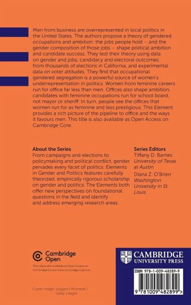 Men from business are overrepresented in local politics in the United States. The authors propose a theory of gendered occupations and ambition: the jobs people hold-and the gender composition of those jobs-shape political ambition and candidate success. This title is also available as Open Access on Cambridge Core.