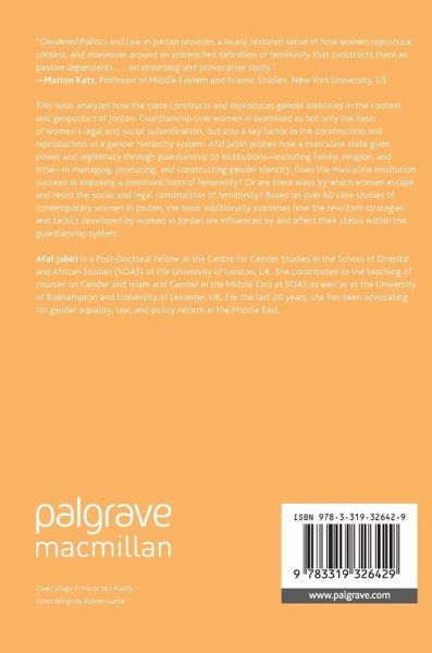 This book analyzes how the state constructs and reproduces gender identities in the context and geopolitics of Jordan. Guardianship over women is examined as not only the basis of women's legal and social subordination, but also a key factor in the construction and reproduction of a gender hierarchy system. Afaf Jabiri probes how a masculine state gives power and legitimacy through guardianship to institutions-including family, religion, and tribe-in managing, producing, and constructing gender identity. Does the masculine institution succeed in imposing a dominant form of femininity? Or are there ways by which women escape and resist the social and legal construction of femininity? Based on over 60 case studies of contemporary women in Jordan, the book additionally examines how the resultant strategies and tactics developed by women in Jordan are influenced by and affect their status within the guardianship system.