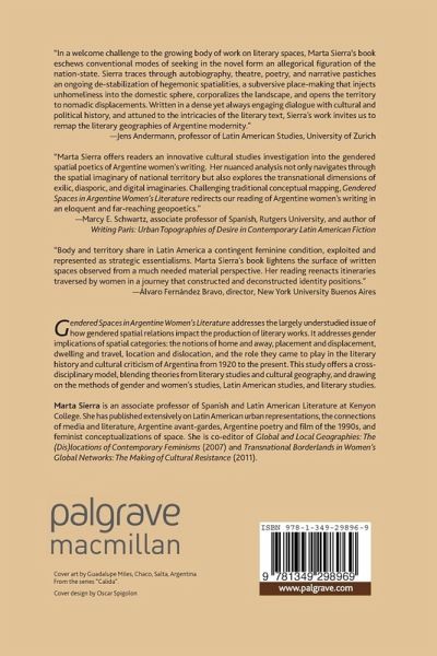 "In a welcome challenge to the growing body of work on literary spaces, Marta Sierra's book eschews conventional modes of seeking in the novel form an allegorical figuration of the nation-state. Sierra traces through autobiography, theatre, poetry and narrative pastiches an ongoing de-stabilization of hegemonic spatialities, a subversive place-making that injects unhomeliness into the domestic sphere, corporalizes the landscape and opens the territory to nomadic displacements. Written in a dense yet always engaging dialogue with cultural and political history, and attuned to the intricacies of the literary text, Sierra'swork invites us to remap the literary geographies of Argentine modernity." - Jens Andermann, professor of Latin American Studies, University of Zurich
