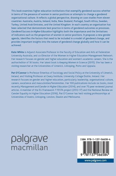 Chapter 1. Introduction: the focus on success stories; Kate White.- Chapter 2. Gender equality as a core academic value: Undoing gender in a "non-traditional" Swedish University; Helen Peterson and Birgitta Jordansson.- Chapter 3. Feminist university management - precondition or indicator for success? An Austrian case study; Angela Wroblewski.- Chapter 4. Women Vice-Chancellors as change agents? An Australian case study; Kate White.- Chapter 5. Changing the gender profile of the professoriate: An Irish case study; Pat O'Connor.- Chapter 6. The exceptionalism of women rectors: a case study from Portugal; Teresa Carvalho and Maria de Lourdes Machado-Taylor.- Chapter 7. Negotiating space for women's academic leadership within the Arab Gulf states; Linzi J Kemp, Christina Gitsaki and Wafa Zoghbor.- Chapter 8. The Athena SWAN Charter: promoting commitment to gender equality in Higher Education Institutions in the UK; Sarah Barnard.- Chapter 9. Making a difference: national and local initiatives for gender equity in New Zealand; Jenny Neale.- Chapter 10. Promoting gender transformation at a higher education institution in South Africa; Connie Zulu.- Chapter 11. Gendered Success and Strategies for Change in a Turkish University; Özlem Atay.- Chapter 12. Who promotes a gender agenda?: an Indian case study; Tanuja Argawala.- Chapter 13. Towards a new gender agenda and a model for change; Pat O'Connor.