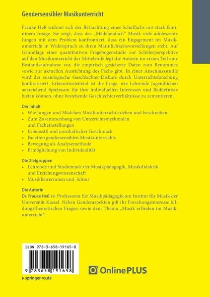 Frauke Heß widmet sich der Betrachtung eines Schulfachs mit stark femininem Image. Sie zeigt, dass das "Mädchenfach" Musik viele adoleszente Jungen mit dem Problem konfrontiert, dass ein Engagement im Musikunterricht in Widerspruch zu ihren Männlichkeitsvorstellungen steht. Auf Grundlage einer quantitativen Fragebogenstudie zur Schülerperspektive auf den Musikunterricht der Mittelstufe legt die Autorin im ersten Teil eine Bestandsaufnahme vor, die empirisch gesicherte Daten zum Renommee sowie zur aktuellen Ausrichtung des Fachs gibt. In einer Anschlussstudie wird der soziologische Geschlechter-Diskurs durch Unterrichtsforschung konkretisiert. Erkenntnisleitend ist die Frage, wie Lehrende Jugendlichen ausreichend Spielraum für ihre individuellen Interessen und Bedürfnisse bieten können, ohne bestehende Geschlechterverhältnisse zu zementieren.