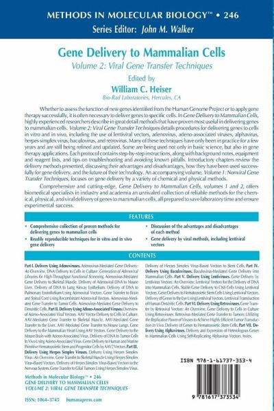 "This unrivaled collection of proven, reliable methods for the chemical, physical, and viral delivery of genes into mammalian cells, presented in great detail by experienced researchers, should be a valuable reference work for novices in this filed and experienced researchers alike." - Medical Oncology