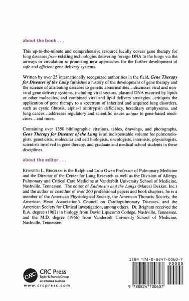 This up-to-the-minute and comprehensive resource lucidly covers gene therapy for lung diseases from existing technologies delivering foreign DNA to the lungs via the airways or circulation to promising new approaches for the further development of safe and efficient gene delivery systems.