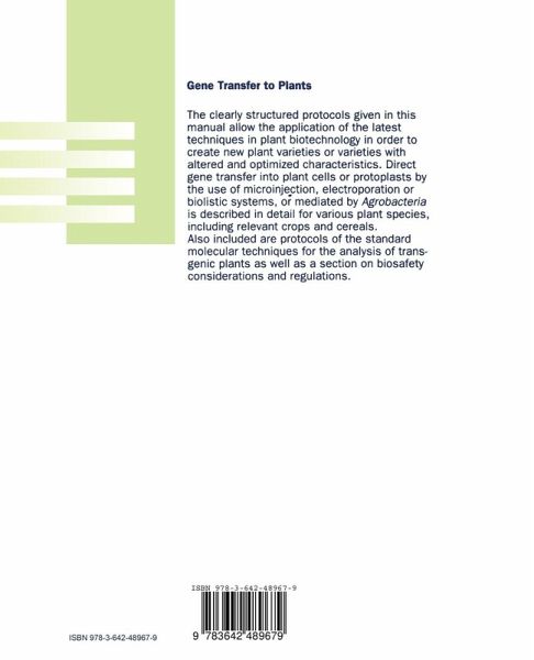 Using the clearly structured protocols given in this manual, it will be easy to apply the latest techniques in plant biotechnology in order to create new plant varieties or varieties with altered and optimized characteristics. Direct gene transfer into plant cells or protoplasts by the use of microinjection, electroporation or biolistic systems, or mediated by Agrobacteria is described in detail for various plant species, including relevant crops and cereals. Also included are protocols of the standard molecular techniques for the analysis of transgenic plants as well as a section on biosafety considerations and regulations.